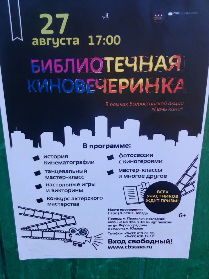 27 августа 2016г. | Ночь кино в #ЧертановоЦентральное. Библиотечная киновечеринка в парке 30-тилетия Победы. |