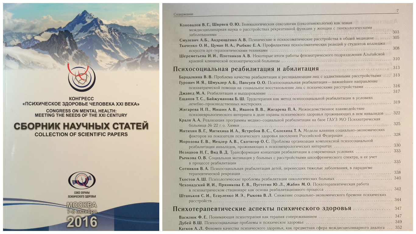 | 7 и 8 октября 2016г. | В Москве прошел Конгресс «Психическое здоровье человека XXI века». В нем приняли участие более 500 представителей международного экспертного сообщества, представленного специалистами системы здравоохранения, охраны труда и социальной защиты, науки и образования, искусства и культуры, спорта и физической культуры, экономики и права, информации и печати. В Конгрессе приняли участие и ведущие сотрудники Психоневрологического интерната № 30. По итогам конгресса издан сборник научных трудов, где свою статью представили сотрудники интерната д.м.н. Жигарева Н.П., к.м.н. Мишин А.В., Иванов В.В. |