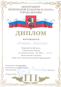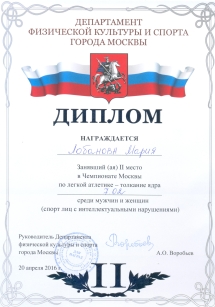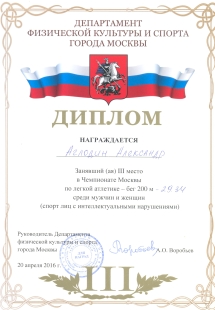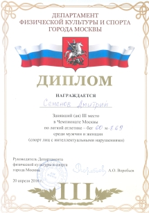 22 декабря 2016г. | Сегодня прошло открытое первенство школы Юность Москвы по лёгкой атлетике Мир равных возможностей. Поздравляем наших призеров, Анна Егина первое место, бег 60 метров, Дмитрий Семенов третье место, бег 1500 метров. Ура! |