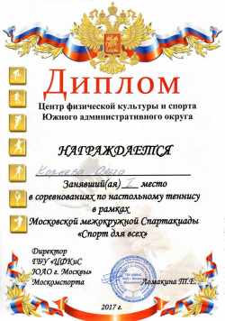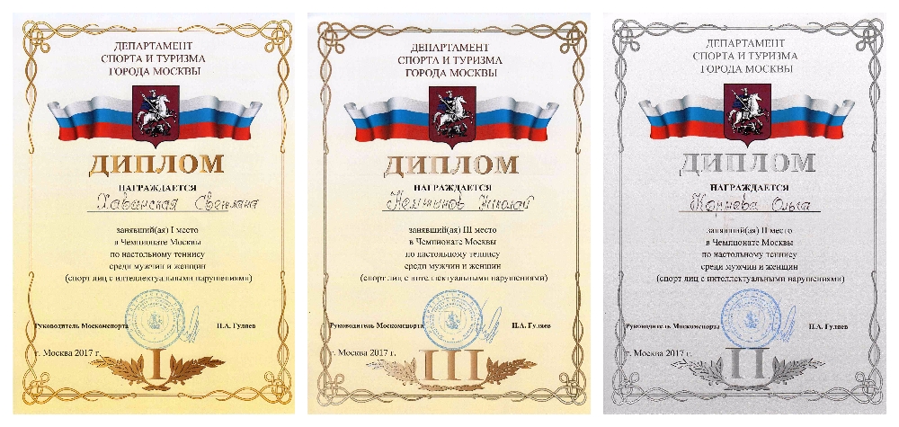 27 марта 2017г. | Поздравляем спортсменов нашего интерната, которые в упорной борьбе стали чемпионами и призёрами Чемпионата г. Москвы по настольному теннису среди ЛИН проходившем на базе ГБУ «Спортивная школа № 93» Москомспорта на Можайском шоссе : 1 место - Хаванская Светлана 2 место - Корнева Ольга 3 место - Немтинов Николай |