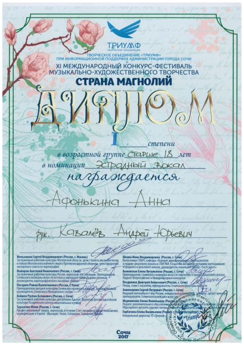17 мая 2017г. | Получатель социальных услуг отделения дневного пребывания ПНИ № 30 Афонькина Анна победила в номинации "Эстрадный вокал" на XI международном конкурс-фестивале музыкально-художественного творчества "Страна магнолий" проходившем в городе Сочи. |