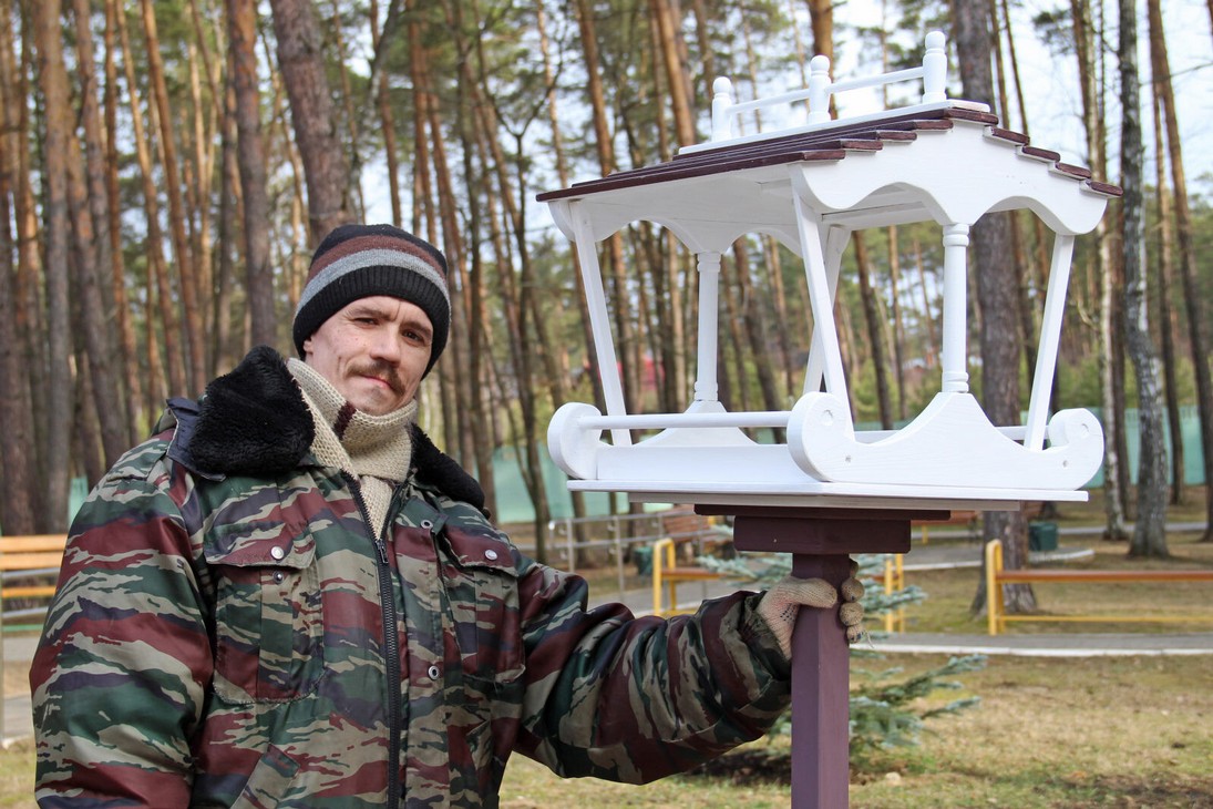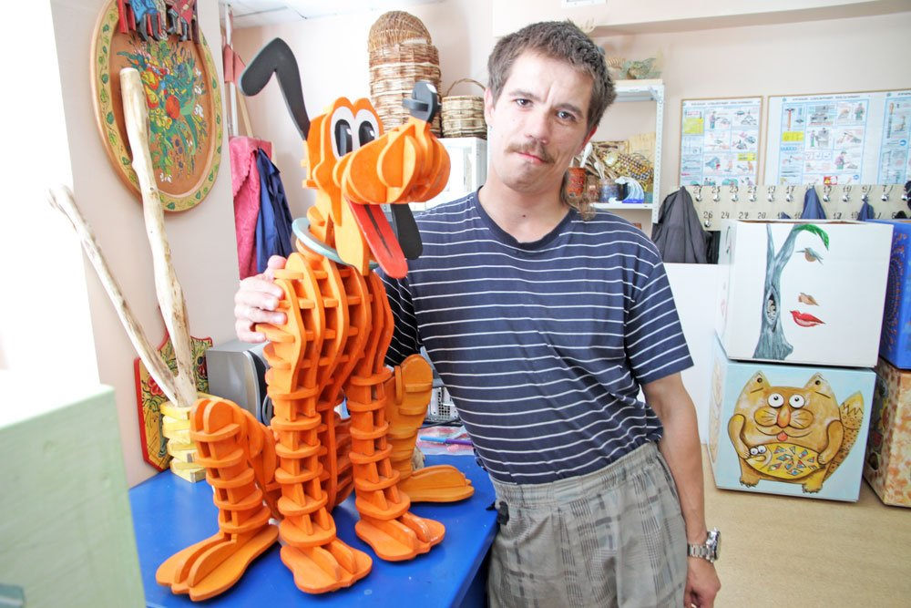 «Когда я впервые сюда попал — ничего не умел делать, и мне Александр Андреевич показывал, как работать с инструментом и материалом. Раньше я видел только доску, а теперь смотрю, и представляю, что из нее можно сотворить. Работа здесь приносит мне огромное удовольствие!» — делится Денис, проживающий Психоневрологического интерната № 13.