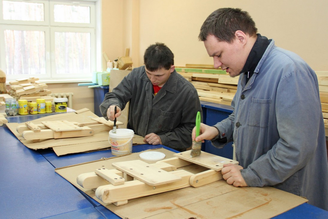 В трудовой мастерской интерната ежедневно трудится около 10 человек, каждому находится занятие по возможностям. Кто-то уже самостоятельно работает с инструментом, кто-то собирает изделие, а кто-то изготавливает детали. Весь трудовой процесс поставлен таким образом, чтобы мастера могли работать и индивидуально, и коллективно.