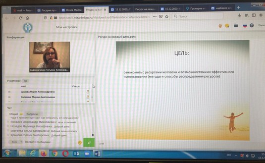 Ведущий вебинара - психолог филиала «Северо-Восточный» ГБУ МСППН Садовниченко Татьяна Александровна подготовила презентацию на столь актуальную в настоящее время тему. Определение собственных ресурсов, основные источники сохранения внутренних и внешних ресурсов, способы их использования для эффективной адаптации в социуме стали предметом обсуждения участников вебинара. Практические зарисовки, современные психологические техники, используемые на вебинаре, позволили участникам найти внутренние и определить внешние ресурсы, способствующие каждому человеку вести активный образ жизни и быть счастливым.